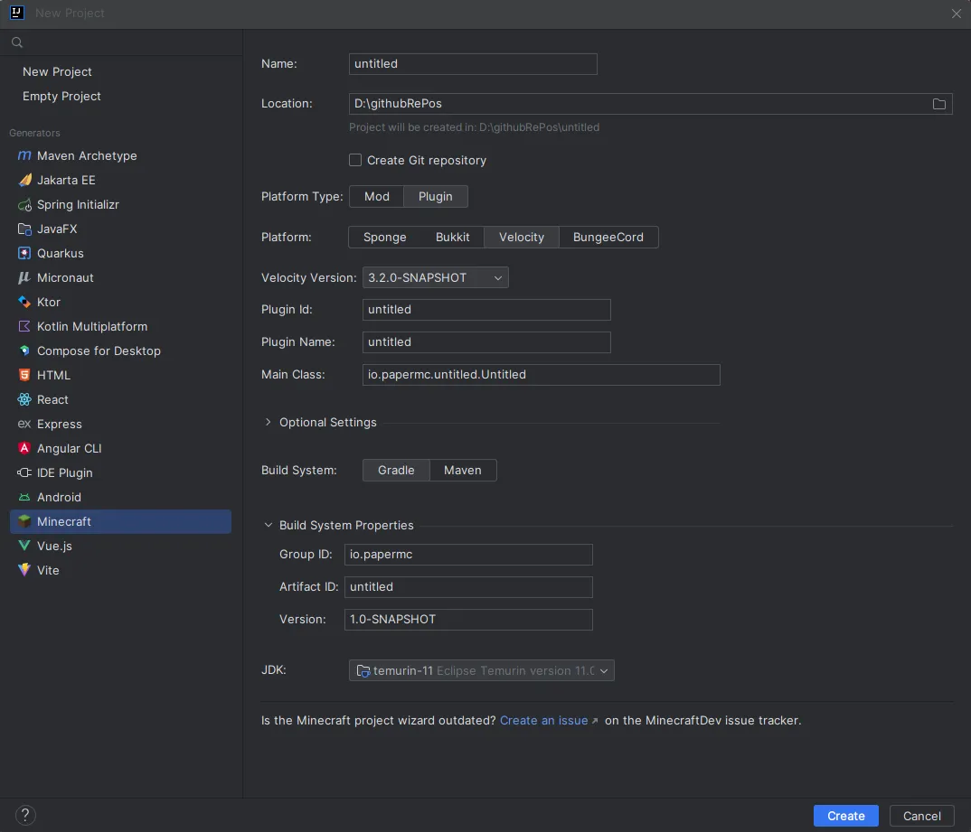 <build> <plugins> <plugin> <groupId>org.apache.maven.plugins</groupId> <artifactId>maven-compiler-plugin</artifactId> <configuration> <!-- add the annotation processor if you want your velocity-plugin.json file to be generated --> <annotationProcessorPaths> <path> <groupId>com.velocitypowered</groupId> <artifactId>velocity-api</artifactId> <version>3.5.0-SNAPSHOT</version> </path> </annotationProcessorPaths> </configuration> </plugin> </plugins> </build></project>Using the Minecraft Development IntelliJ plugin